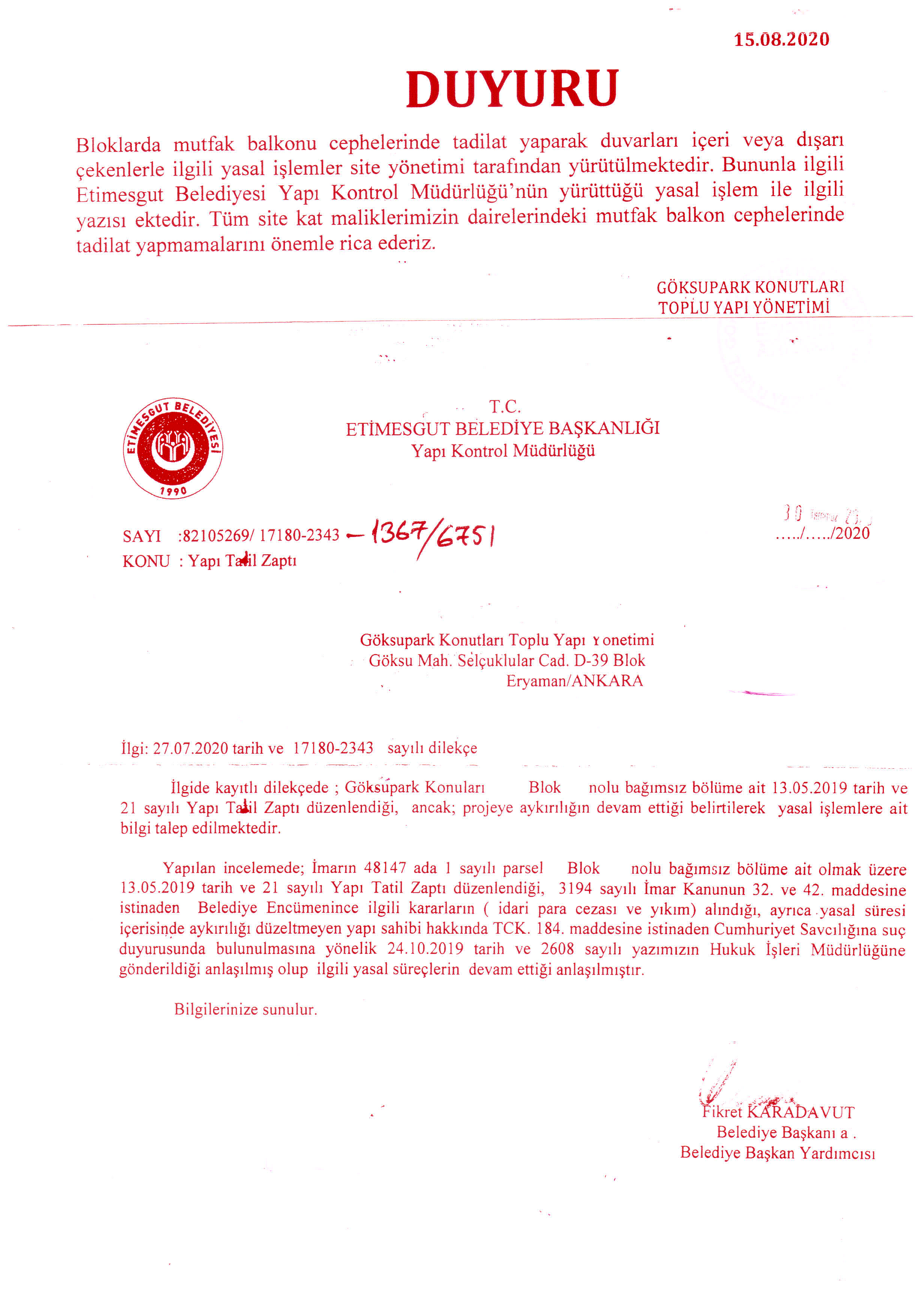 - Bloklarda, Mutfak Balkonu Cephelerinde, Tadilat Yapanlarla İlgili Yasal İşlem Site Yönetimi Tarafından Yürütülmektedir. Ayrıntılar için tıklayınız...