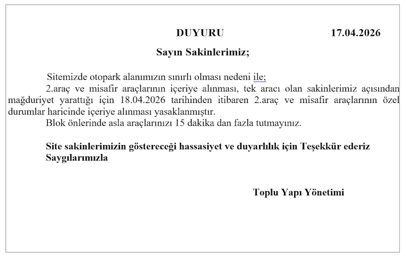 - Bloklarda, Mutfak Balkonu Cephelerinde, Tadilat Yapanlarla İlgili Yasal İşlem Site Yönetimi Tarafından Yürütülmektedir. Ayrıntılar için tıklayınız...